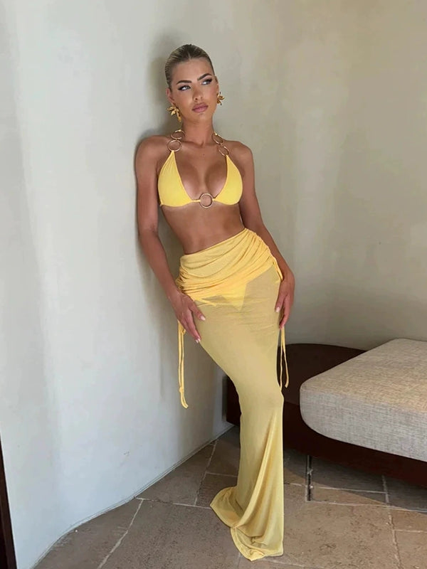 ZASUWA Female Solid Color Mesh with Metal Ring 3-Pieces Bikini Set