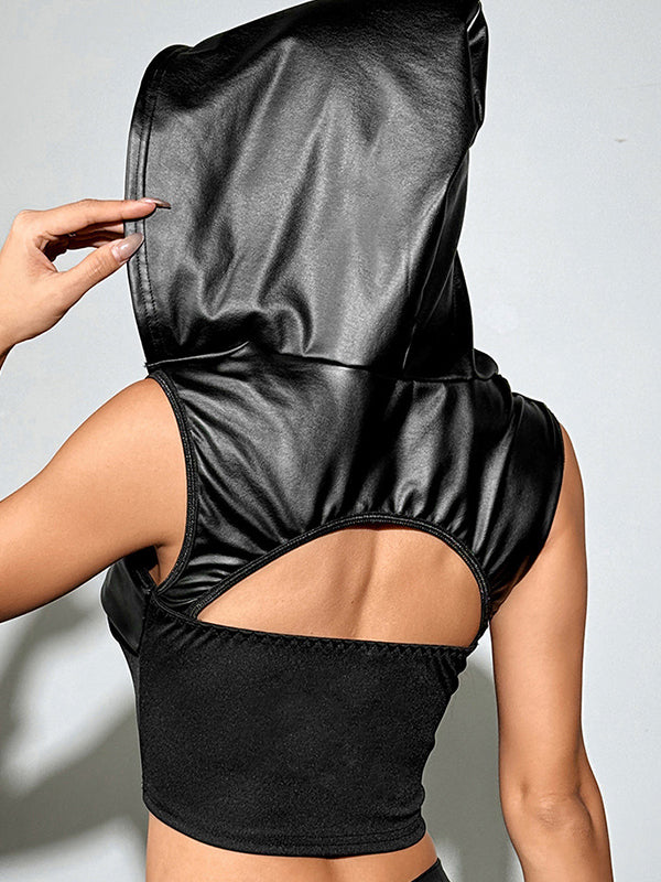 ZASUWA Female Sexy PU Hollow Out Hooded Vests