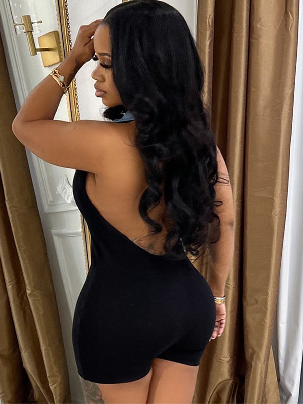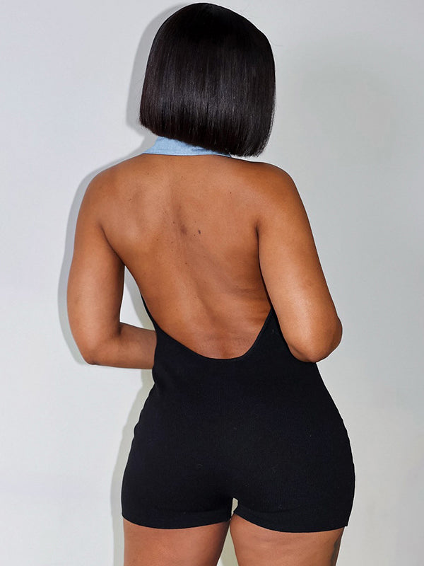ZASUWA Female Stand Up Collar Contrast Color with Metal Buttons Backless Romper